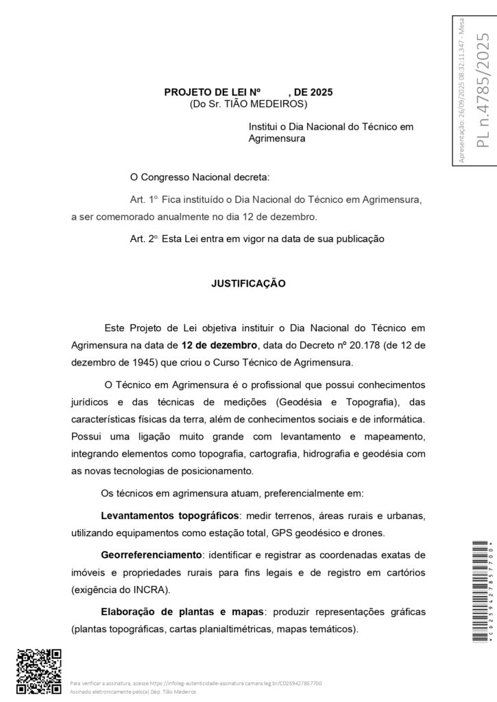 O Conselho Federal dos Técnicos Industriais (CFT) apoia o Projeto de Lei n.º 4785/2025, que institui o Dia Nacional dos Técnicos em Agrimensura. A proposta é de autoria do deputado federal Tião Medeiros (PP/PR) e foi sugerida pelos professores do curso técnico em Agrimensura do Instituto Federal de Santa Catarina (IFSC).