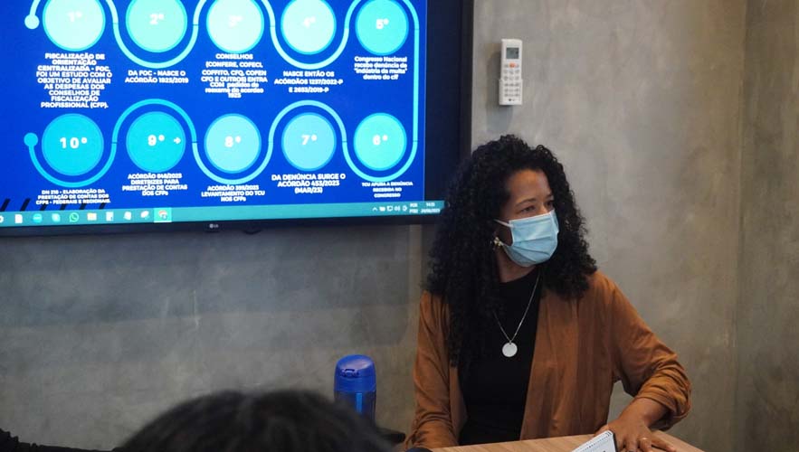 A visita começou com uma apresentação sobre os Acórdãos do Tribunal de Contas da União (TCU) pertinentes à Fiscalização, da qual participaram Johnathan Lacerda, gerente de Fiscalização do CRT-01, e Luna de Andrade, coordenadora de Fiscalização do CRT-01. Nos próximos dias, a equipe do CFT vai avaliar indicadores da fiscalização no regional que abrange o Distrito Federal e os estados do Acre, Amazonas, Goiás, Mato Grosso, Mato Grosso do Sul, Roraima, Rondônia e Tocantins.
