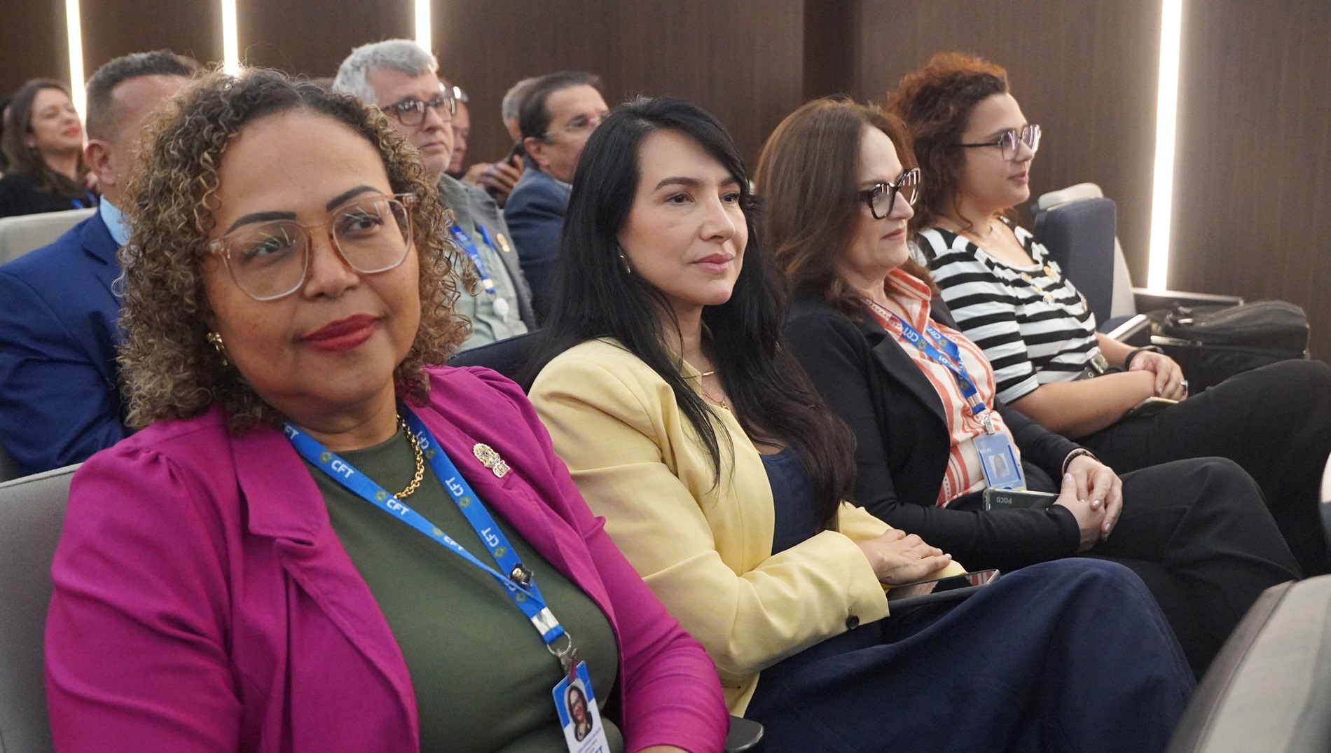 Os presidentes João Batista Souza (CRT-02), Jerônimo Andrade (CRT-RN), Wilson Wanderlei Vieira (Oitec), ao lado de Tainã Cristina de Oliveira Teixeira, coordenadora do Fórum Nacional de Valorização da Atuação de Profissionais com Identidade de Gênero Feminino do Sistema CFT/CRT, deputado Lucinildo Frota (Ceará) e representantes da Oitec Innternacional, também usaram a palavra.